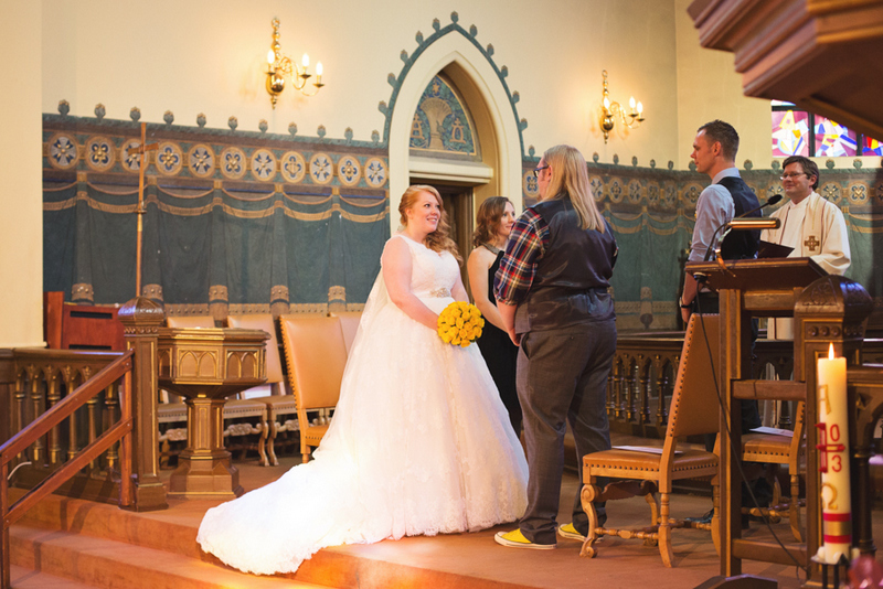 LEVERANDØRER: Bryllupsfotograf: Studio LL // Brudekjole: Pronovias Bermeo // Brudens sko: Spesialbestilte fra Converse i USA // Hår & Makeup: Anette B. Klophus // Brudgommens Antrekk: Skjorte, bukse og vest fra Dressmann, slips og "knappehullsblomst" laget av gitarplekter, alt fra Etsy // Brudebukett: Kreativ Flora i Oslo med en kattebrosje fra Etsy